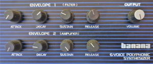Es gibt zwei Hüllkurven mit klassischem ADSR-Aufbau. Der Output-Regler ist für die Gesamtlautstärke, diese wird nicht im Patch gespeichert.