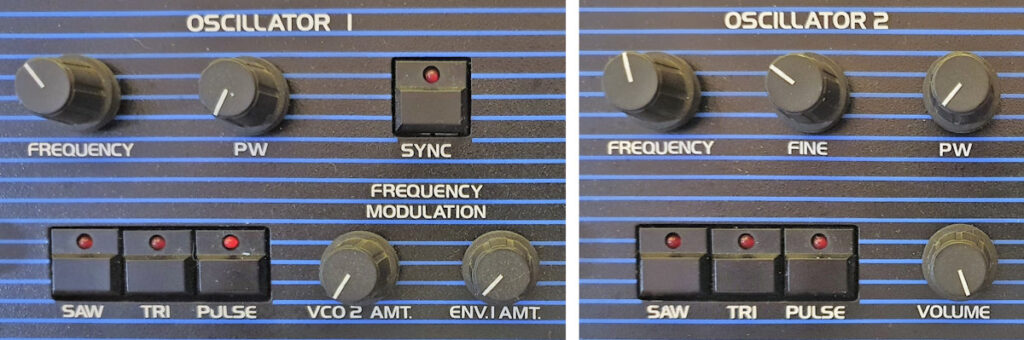 Sechs Voice-Karten beinhaltet die Standard-Ausstattung. Jede Stimme hat 2 Oszillatoren (VCOs) mit den Kurvenformen SAW, TRIANGEL und PULSE. Die Pulse-Weite ist manuell oder durch Modulation veränderbar. Kurvenformen sind additiv wählbar, eine stufenlose Mischmöglichkeit besteht jedoch nicht. Für beide VCOs ist die Frequenz ohne Oktavstufung oder Rasterung frei einstellbar. Ein VCO-Sync ist machbar, VCO1 kann zudem durch die Filterhüllkurve moduliert werden. Cross-Modulation von VCO1 durch VCO2 ist möglich.