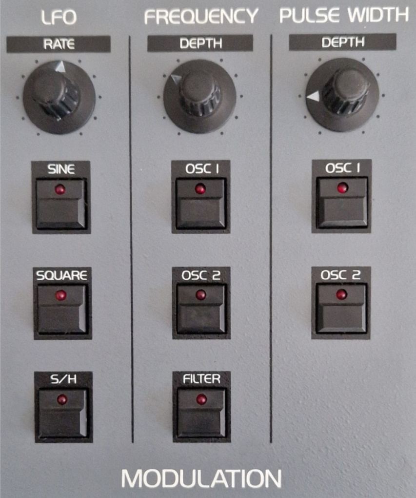 Dieser Bereich verfügt über einen LFO (low-frequency-Oscillator) mit 3 Quell-Signalen, die allerdings nur alternativ schaltbar sind. Dazu gehört auch ein sample & hold. Modulierbar mit variabler Tiefe sind OSC-1/2 und Filter. Auch die Pulsweite der OSC ist variabel ansteuerbar. Leider verfügt der OB-X nur über diesen einen LFO.