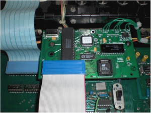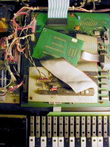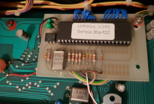 Das Interface (die helle Platine) befand sich in einem Xa aus früher Fertigung. Die Fähigkeiten sind rudimentär und beschränken sich auf Programm-Wahl und Note-On/Off. Der Midi-Kanal wird manuell auf der Platine eingestellt. Benötigt wird offensichtlich eine angepasste Firmware. Der Einbau ist vergleichsweise einfach und die Grundfunktionen sind vorhanden. Das Bild zeigt zudem das Kabelgewirr, weil auch noch eine Speichererweiterung eingebaut ist. Für aktuelle Umbauten wohl nur noch bedingt empfehlenswert.