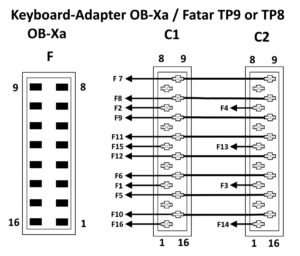 Nachfolgend die Beschreibung des Kabeladapters zum Anschluss der Fatar-Tastatur an den OB-Xa. F ist der Tastaturanschluss auf dem Lower Controlboard des OB-Xa. C1 und C2 sind die Kabelanschlüsse (Micromatch) auf der Unterseite der Fatar-Tastatur.